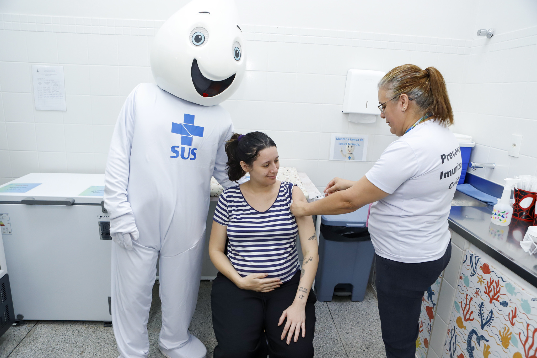 No Dia D haverá um cuidado especial com as gestantes. Além de se vacinarem contra a gripe e covid-19, elas poderão receber a vacina VSR, que oferece proteção ao bebê nos primeiros meses de vida contra o vírus sincicial respiratório, um dos principais causadores da bronquiolite e da pneumonia em crianças de até 2 anos. Nesse caso, a indicação é que a vacina seja aplicada em todas as mulheres com pelo menos 28 semanas de gestação. Atualmente há um estoque disponível de mais de três mil doses.