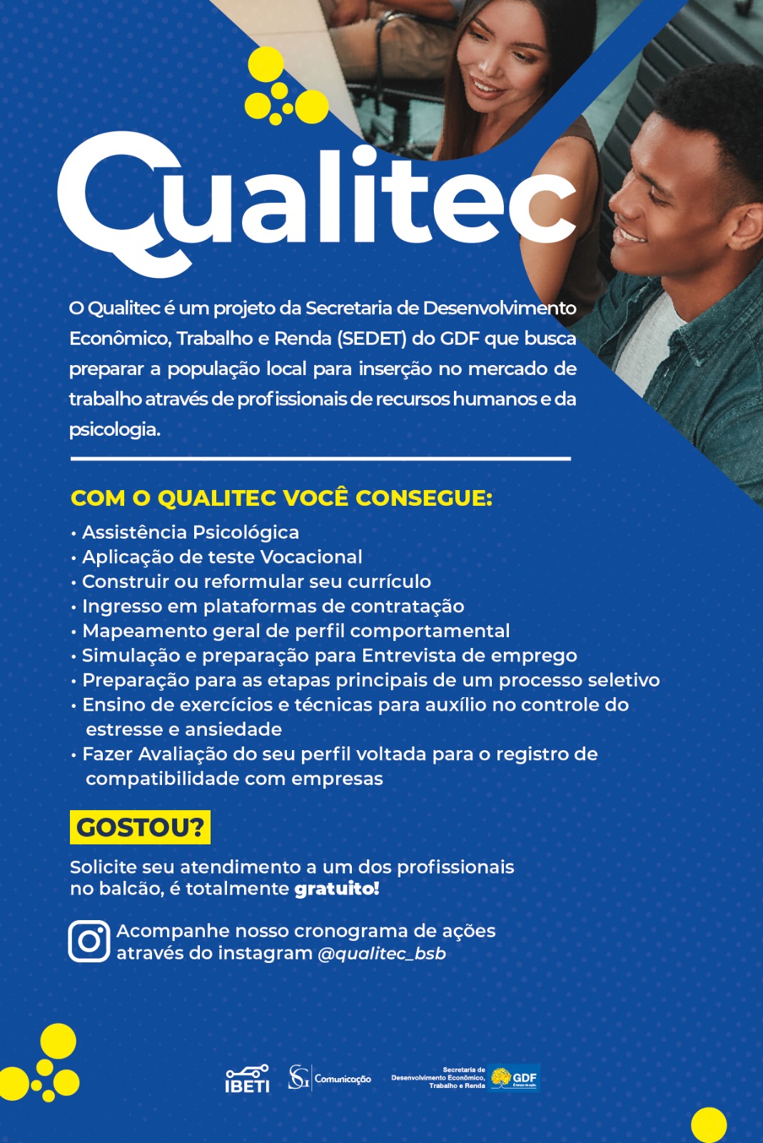 Entre serviços ofertados está incluso análise e construção de currículos, avaliação do perfil do candidato, simulação de entrevista de emprego, aplicação de teste vocacional, direcionamento para plataformas de recrutamento, entre outras assistências aos candidatos. Para participar basta ir até uma Agência do Trabalhador nas regiões do Plano Piloto, Taguatinga, Ceilândia, Santa Maria, Gama, Samambaia, Riacho Fundo II, Sobradinho, Recanto das Emas, Estrutural, Brazlândia, Planaltina, São Sebastião e Itapoã.